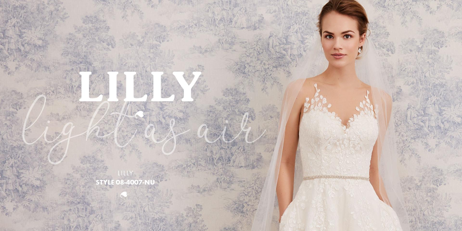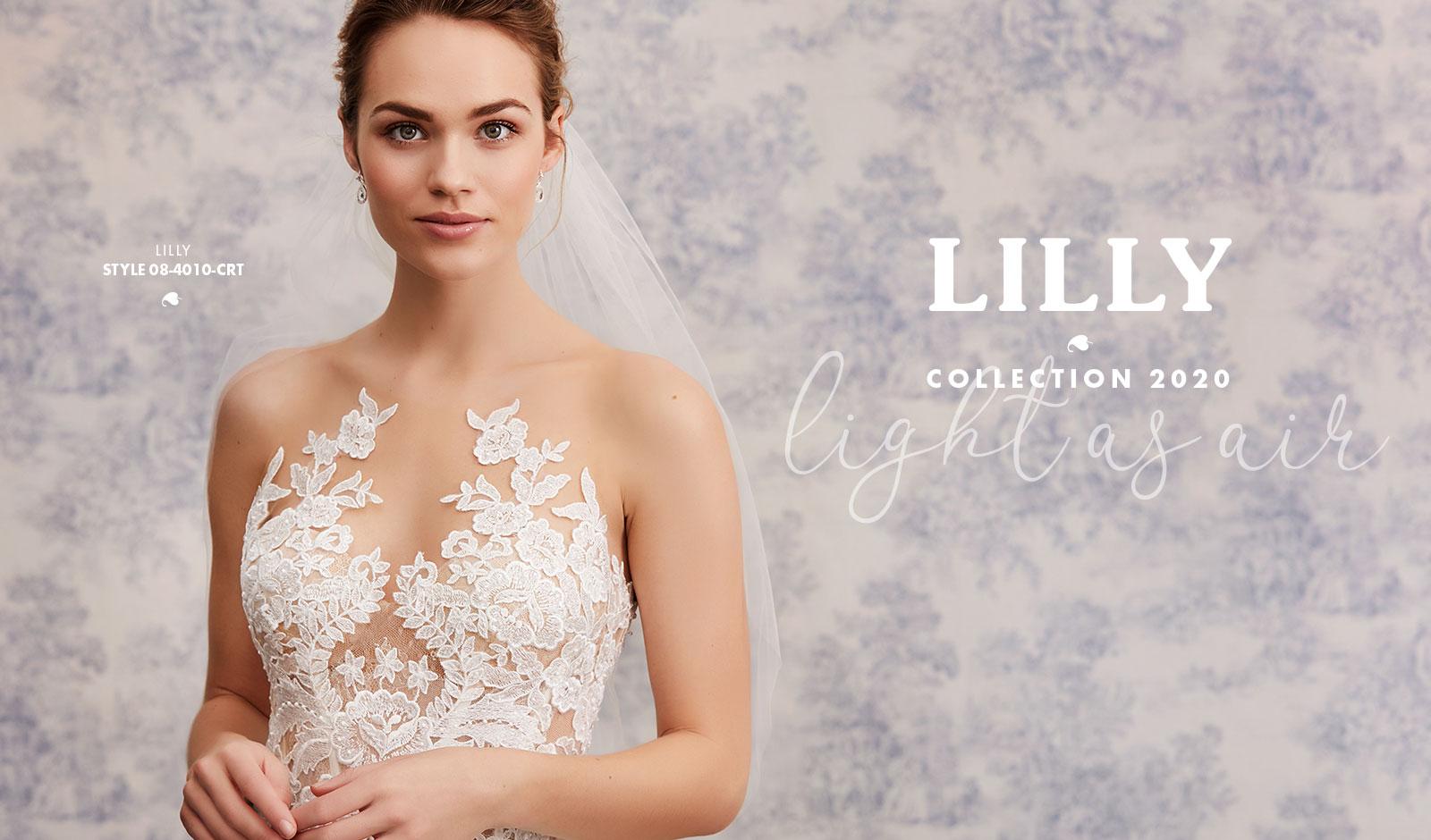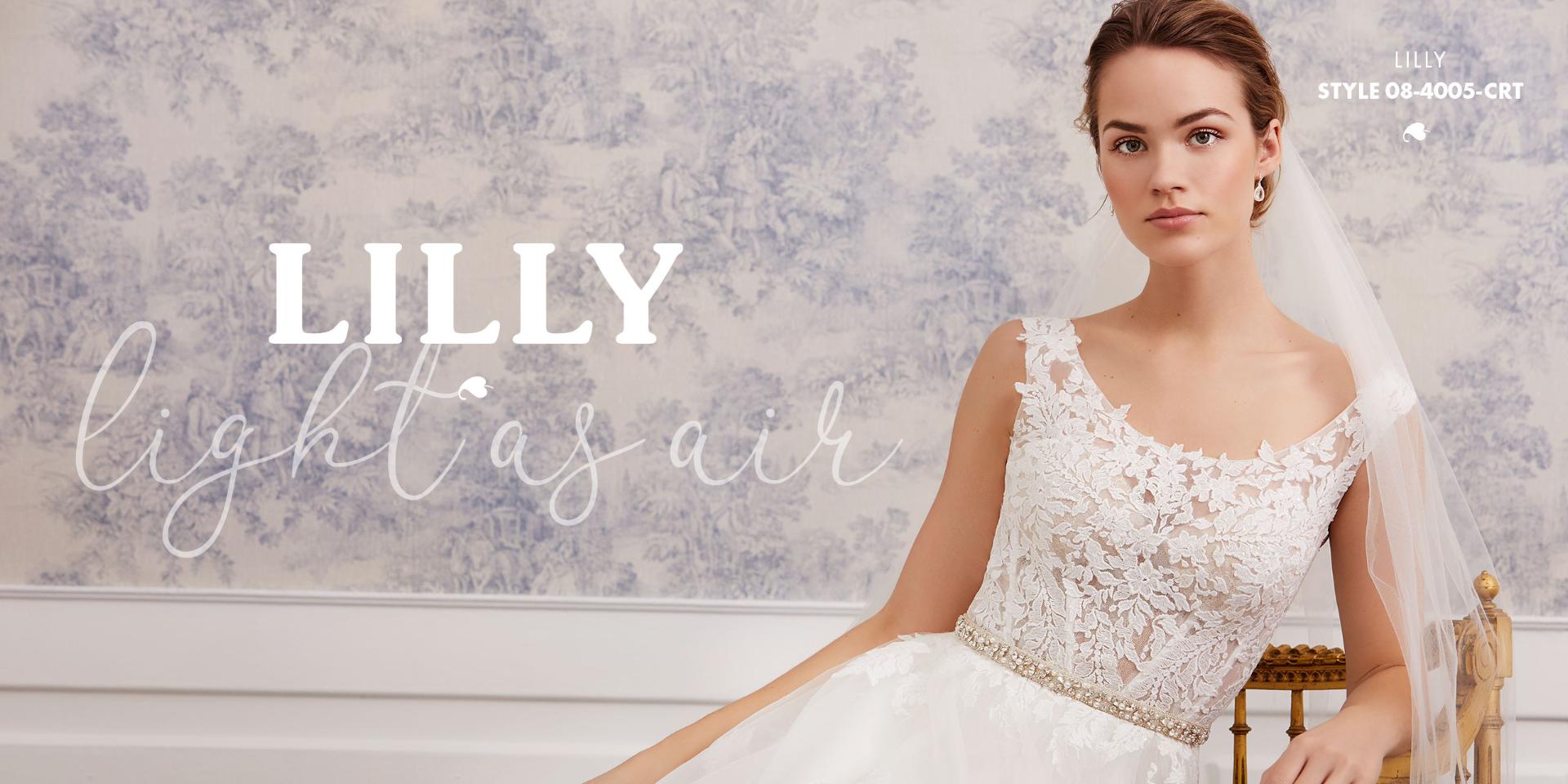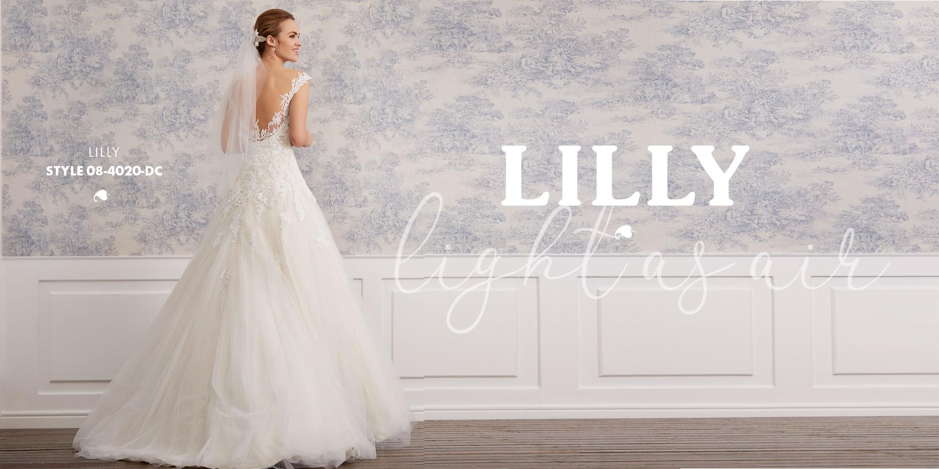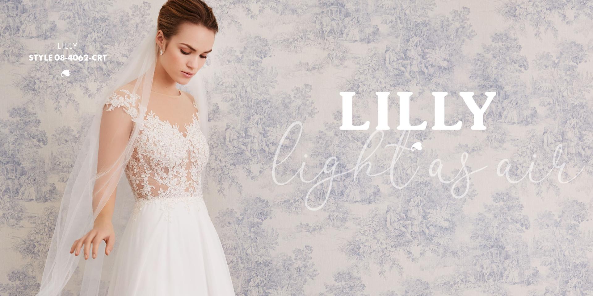 Lette brudekjoler i excellente pasformer, der smyger sig om den feminine silhuet, med vovede detaljer og fine gennemsigtige finésser. De lette materialer svæver blødt om kroppen og farverne er mikset i bløde cremede nuancer, der fremhæver de smukke blonder i moderne antik-look, understreget af glimmer i form af  diskrete perler og pailletter.