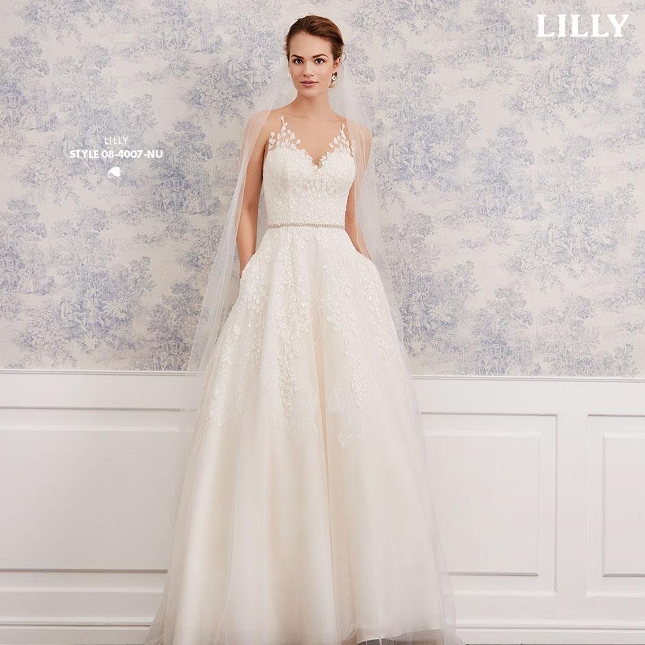 Hvis du drømmer om eventyr, er denne brudekjole perfekt til dig! Den fine blonde med bladmønster i 3D svæver usynligt på en bund af hudfarvet tyl og fremhæver kjolen's lethed - de skjulte lommer er en fin detalje.
